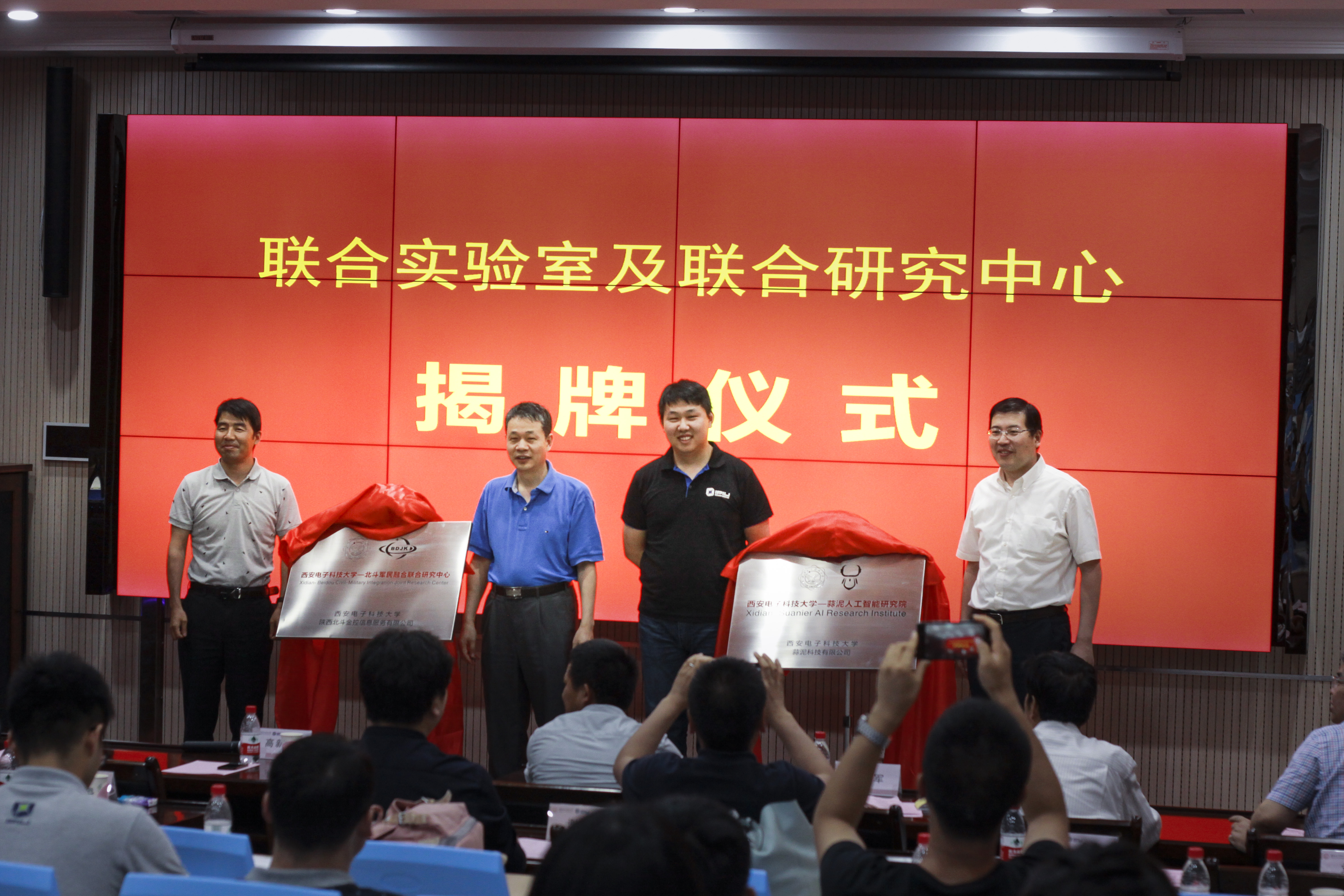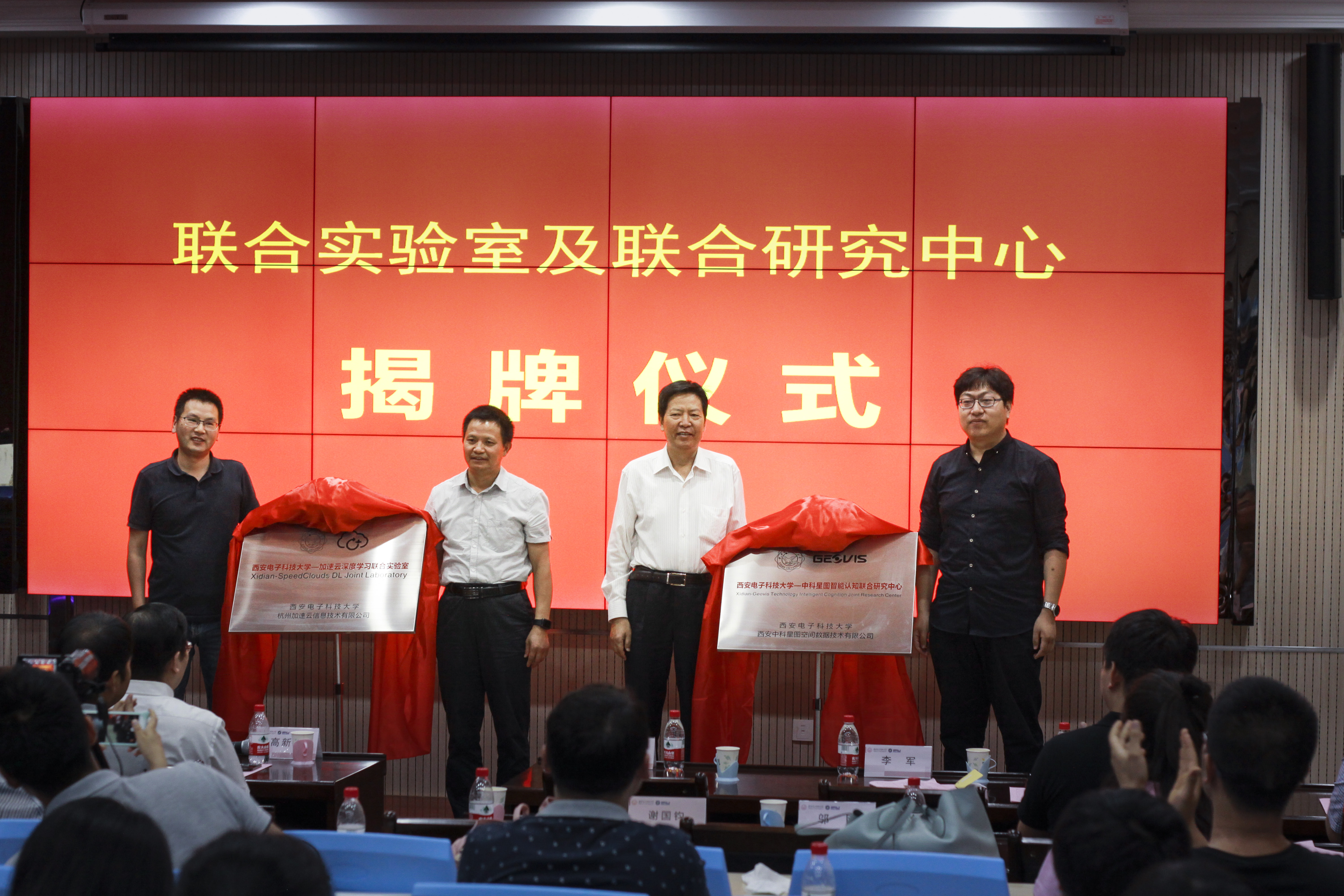 此外,beat365中文官方网站-北斗军民融合联合研究中心、beat365中文官方网站-蒜泥人工智能研究院、beat365中文官方网站-加速云深度学习联合实验室及beat365中文官方网站-中科星图智能认知联合研究中心也正式揭牌,陕西北斗金控信息服务公司董事长李卫斌、西安蒜泥科技有限公司创始人杨少毅、谢雯雯、杭州加速云信息技术有限公司CEO邬刚、西安中科星图空间数据技术有限公司总经理谢国钧出席了仪式并揭牌,电子工程学院院长廖桂生致辞祝贺。