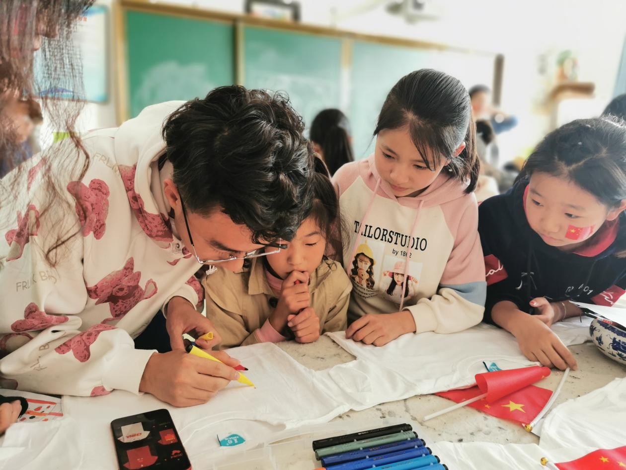 在美术书法教室中,孩子们绘画的样子投入认真。一件件小尺码的白T恤,一盒盒五颜六色的水彩笔 ,6~8人一组,每个人都给属于自己的白T恤画上了对祖国母亲的爱。有的用红色的彩笔写上了大大的“我爱祖国”“CHINA”;有的给领口上画上了鲜艳的红领巾;有的DIY了一面大大的国旗;还有的在白T上绘出了一幅幅内心中美好祖国的样子:蓝天、白云、绿树、国旗……一张张稚嫩的脸庞,一个个聪明的脑袋,天马行空地在衣服上发挥自己的想象力。