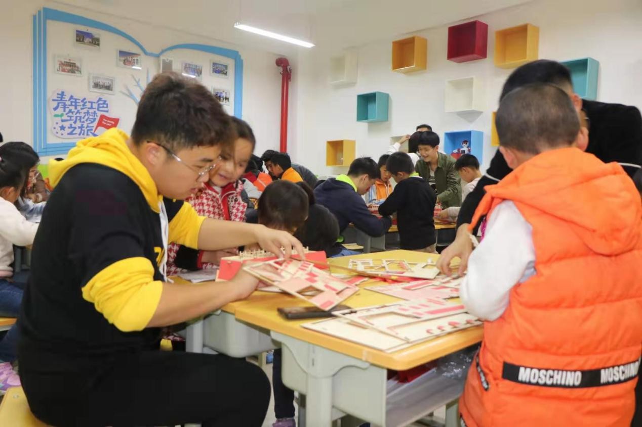 在青年红色筑梦之旅科创小屋中,孩子们在志愿者的指导下学习动手拼装天安门模型,动作快捷精准。一名志愿者带着两个孩子,把一个个小木块拼成宏伟壮观的天安门,或许,他们拼接的不是积木,而是对祖国浓烈的爱!西电的志愿者帮助他们创造着一个他们没有见过的世界,在他们心中种下一颗梦想的种子,相信未来,他们定会向着自己的小小梦想,一步步的坚定前进!