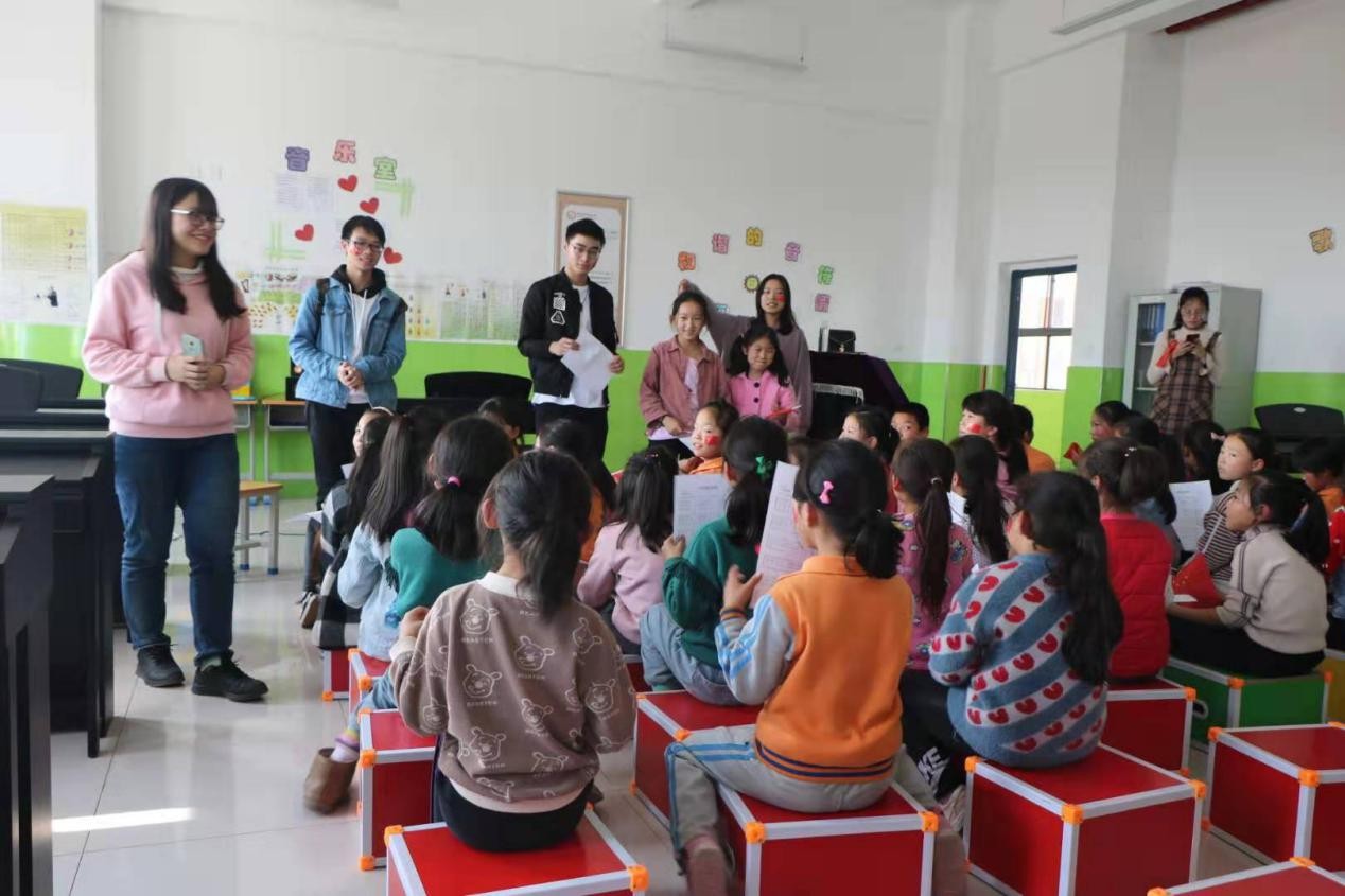 在音乐教室中,孩子们歌唱的声音悦耳悠扬。《我和我的祖国》在今年响彻了大江南北,或许孩子们的音调并不标准,但是他们都在大声歌唱。志愿者们教一句,学生们跟着唱一句,遇到不认识的字,大哥哥大姐姐们便会给予耐心解释。过程中大家互相聊天,轻松愉快。休息时间,志愿者们还给小朋友唱他们喜欢的歌,时而单人独奏,时而多人合唱,音乐室里充满了欢快的气息。