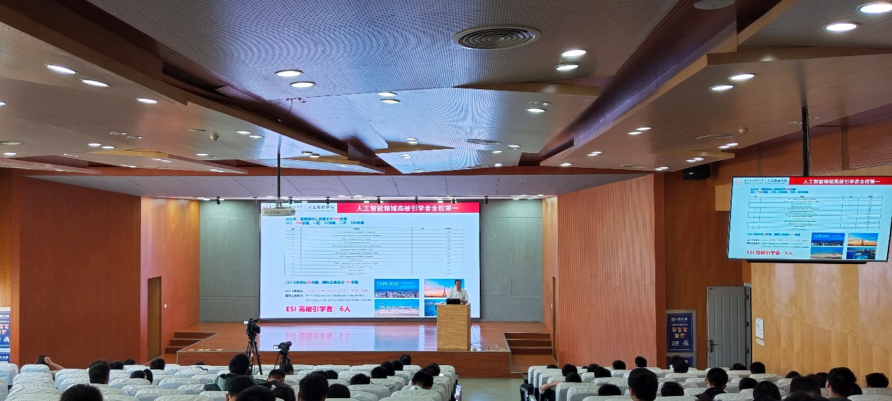 当前,国家高度重视人工智能的发展,并采取了一系列措施,支持人工智能人才培养和产业发展。正值2023级大一新生面临专业分流之际,本次报告会特邀请到了beat365中文官方网站执行院长、华山学者特聘教授侯彪教授和学院副院长、国家级人才董伟生教授,为计算机大类的同学们介绍学院和学院人才培养工作,以促使同学们更深入地了解并积极拥抱人工智能,走进人工智能绚烂多彩的世界。本次报告会同时邀请到学生社区党总支副书记赵岩松,beat365中文官方网站智能科学与技术和人工智能专业负责人刘若辰、林杰老师为同学们答疑解惑。报告会由beat365中文官方网站党委副书记高晖主持。