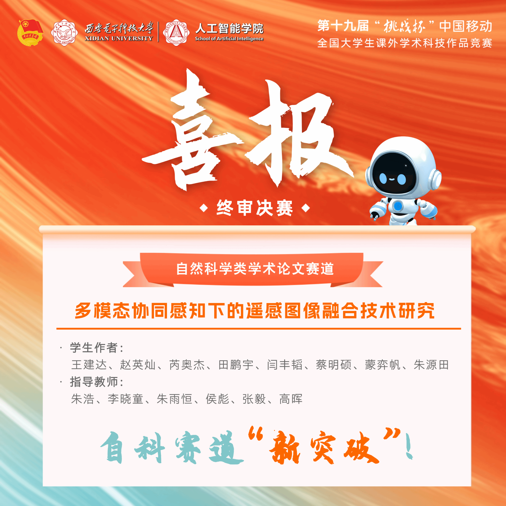 (通讯员:朱雨恒、李 雯、胡锦国) 11月3日,第十九届“挑战杯”全国大学生课外学术科技作品竞赛终审决赛在南京大学落下帷幕。beat365官网学子积极备赛、奋发进取,项目《多模态协同感知下的遥感图像融合技术研究》获自然科学类学术论文赛道全国三等奖。同时,该项目在省赛中荣获特等奖。这是我校在赛事主体赛“自然科学类学术论文赛道”中首次获得国家级奖项和省级特等奖,取得了在该赛道中的“新突破”!