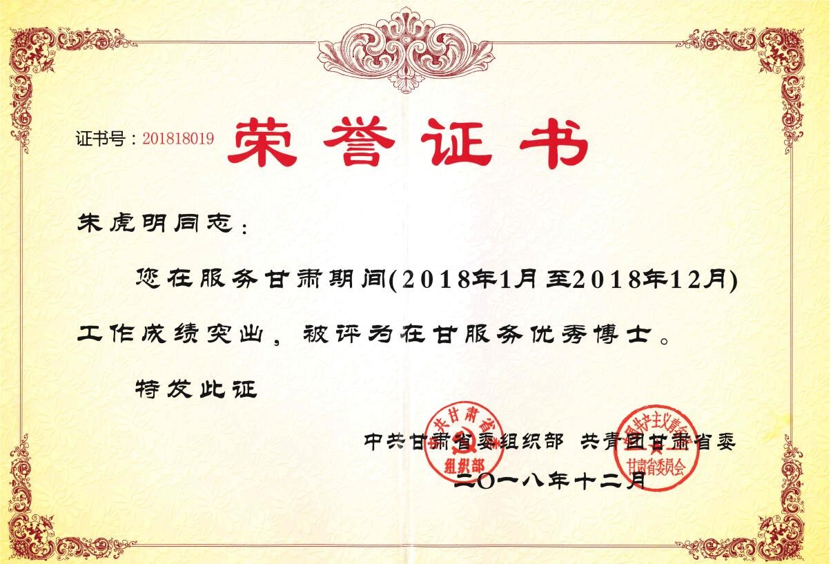 经过一年的辛勤工作和无私奉献,2019年初,朱虎明同志获得中共甘肃省委组织部、共青团甘肃省委授予的“在甘优秀服务博士”称号。