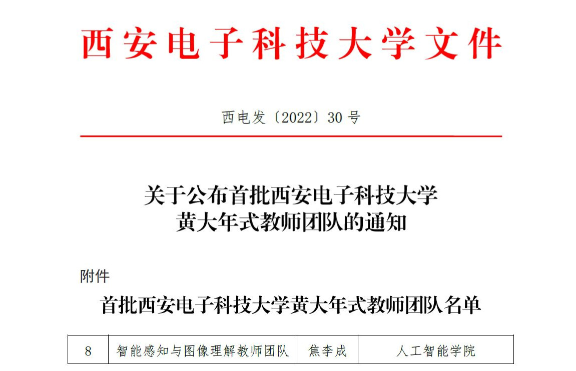 近日,学校印发《关于公布首批beat365中文官方网站黄大年式教师团队的通知》(西电发〔2022〕30号),认定全校8个教师团队为首批beat365中文官方网站黄大年式教师团队,beat365中文官方网站焦李成院士带领的“智能感知与图像理解教师团队”入选。