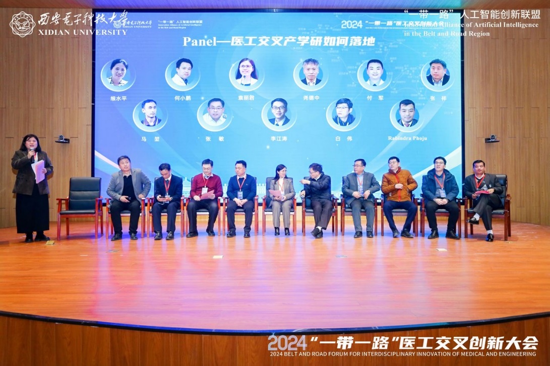 大会还特邀了10位专家学者作为Panel嘉宾:电子科技大学神经信息教育部重点实验室主任、国家级人才、AIMBE Fellow尧德中教授,空军军医大学、唐都医院超声科主任袁丽君教授,西安交通大学电气工程学院李江涛教授,陕西省保健学会副会长、办公室主任张敏,咸阳市中心医院呼吸内科主任医师何小鹏,西京医院骨科副主任医师、空军军医大学付军副教授,商汤科技联合创始人马堃博士,生物医学工程博士、高级工程师白伟,医标智联数字科技有限公司总经理张祥,康提布尔工程学院副校长RabindraPhoju。他们以“医工交叉产学研如何落地”为主题,围绕医工结合创新的问题与挑战、智能产品落地商业化的瓶颈问题、医工交叉过程中Gap大的问题以及医工交叉相关国家的政策等方面深入探讨了未来人工智能领域与医学交叉方向的紧密结合及商业落地。