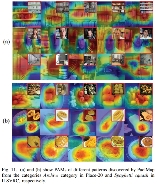 上图展示了方法在ILSVRC2012中的“档案室”“南瓜意面”中的结果。红色到深蓝色代表网络从感兴趣到不感兴趣,每张热力图的右上角是原图。可以看出,在“档案室”中,每种模式分别是,整齐排列的档案、人像后的档案、存储档案的柜子三种模式。在“南瓜意面”中,三种模式分别是,完整的南瓜、南瓜壤、做好的意面三种模式。更详细的证明和更多的实验结果见论文:https://ieeexplore.ieee.org/document/9944792