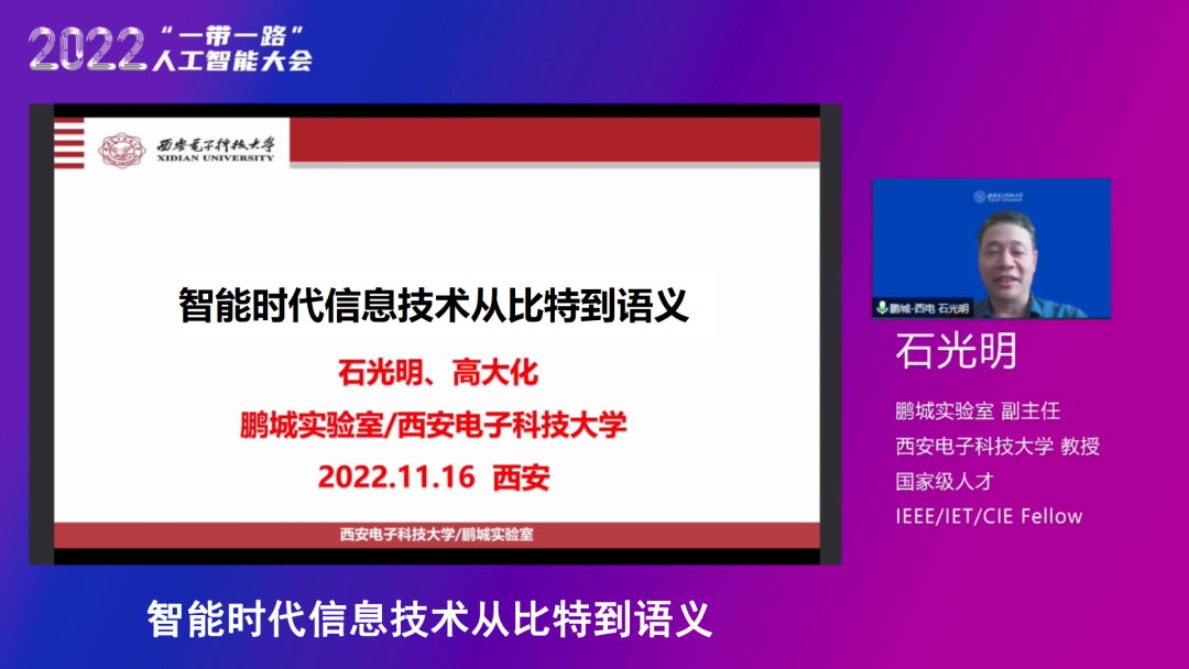 鹏城实验室副主任、IEEE /IET/CIE Fellow、beat365中文官方网站石光明教授首先对信息技术做了阐释。传统的信息技术以比特为基础,以系统复杂度换取性能增益。但随着信息技术的演进,通信系统需求逐渐从信息传递变为增强情感体验。通信的本质是内容的传输,但其更重要的目的是达意,即体验的再现。未来的6G通信包含了更多的场景与需求,如沉浸式服务、个性化服务、极端性能需求、通感融合等,特别是从信号向内容的转变,这些应用已经不能单纯通过增加天线、带宽、功耗等资源来实现。香农理论指导了过去几十年通信行业的发展,但它主要关注数据比特传输,很难继续指引通信向未来目标发展。未来通信的目标一定是:极低时延、最少资源、广泛链接、准确达意和正确理解。