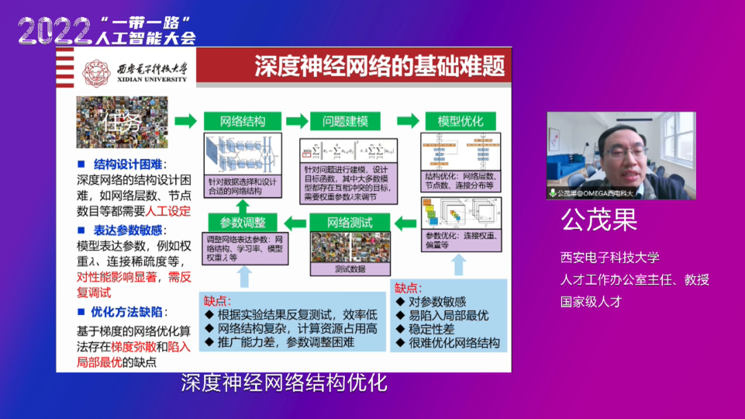 国家级人才、beat365中文官方网站公茂果教授的报告介绍了团队近期在解决深度神经网络结构优化难题上的一些思路和尝试,以及在深度神经网络应用上的一些新进展。公茂果教授的报告从四个方面展开,第一,深度神经网络的优势和困难。深度神经网络的优势包括:深层结构,复杂建模,特征学习,自主分析,推广性强,应用广泛。深度神经网络的困难包括:结构设计困难、表达参数敏感和优化方法缺陷。第二,深度神经网络结构优化初探。具体分为以下五个方面:1.避免表达参数。2.超越梯度优化。团队提出的自然梯度优化结合了华为昇腾AI计算芯片中使用的达芬奇架构,可以批量化的计算小矩阵的逆,能够进一步提升计算效率。3.神经网络压缩。团队提出了网络流数据分类的神经网络压缩方法,将生成对抗训练和知识蒸馏相结合,并对网络重要性因子进行稀疏约束,达到网络裁剪目的,得到压缩率与准确率的平衡。4.隐私保护学习。针对数据分散且无法集中收集或共享的问题,团队提出了多方对偶学习,通过对偶预测补全缺失数据,保持原有数据结构不变,重叠验证扩充训练数据。此框架同时保护了数据隐私性和计算安全性。5.训练样本学习。团队提出了SPL模型和MOSPL模型,通过协同训练产生预测概率对节点进行排序,采用自步学习逐步将节点加入到训练集中,一方面将高置信度的伪标签扩充至训练集,另一方面减轻难以分类的节点对模型训练产生的扰动。第三,遥感影像变化检测应用探索。公茂果教授从遥感影像变化检测、多类变化检测、超像素变化检测、多视角变化检测、特定目标变化检测以及高光谱影像变化检测等多个方面进行了应用探索。最后,公茂果教授对深度神经网络结构优化的未来发展方向进行了展望。