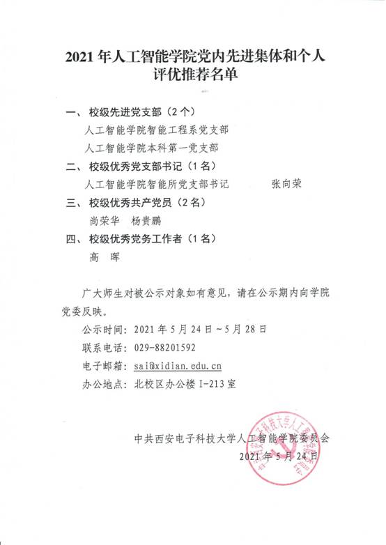 按照校党委《关于做好2021年度党内先进集体和个人评选表彰工作的通知》(西电党组〔2021〕16号)要求和学院工作安排,经各支部酝酿推荐,学院党委会集体研究,2021年度beat365中文官方网站党内评优拟推荐名单如下,现按照有关规定予以公示。