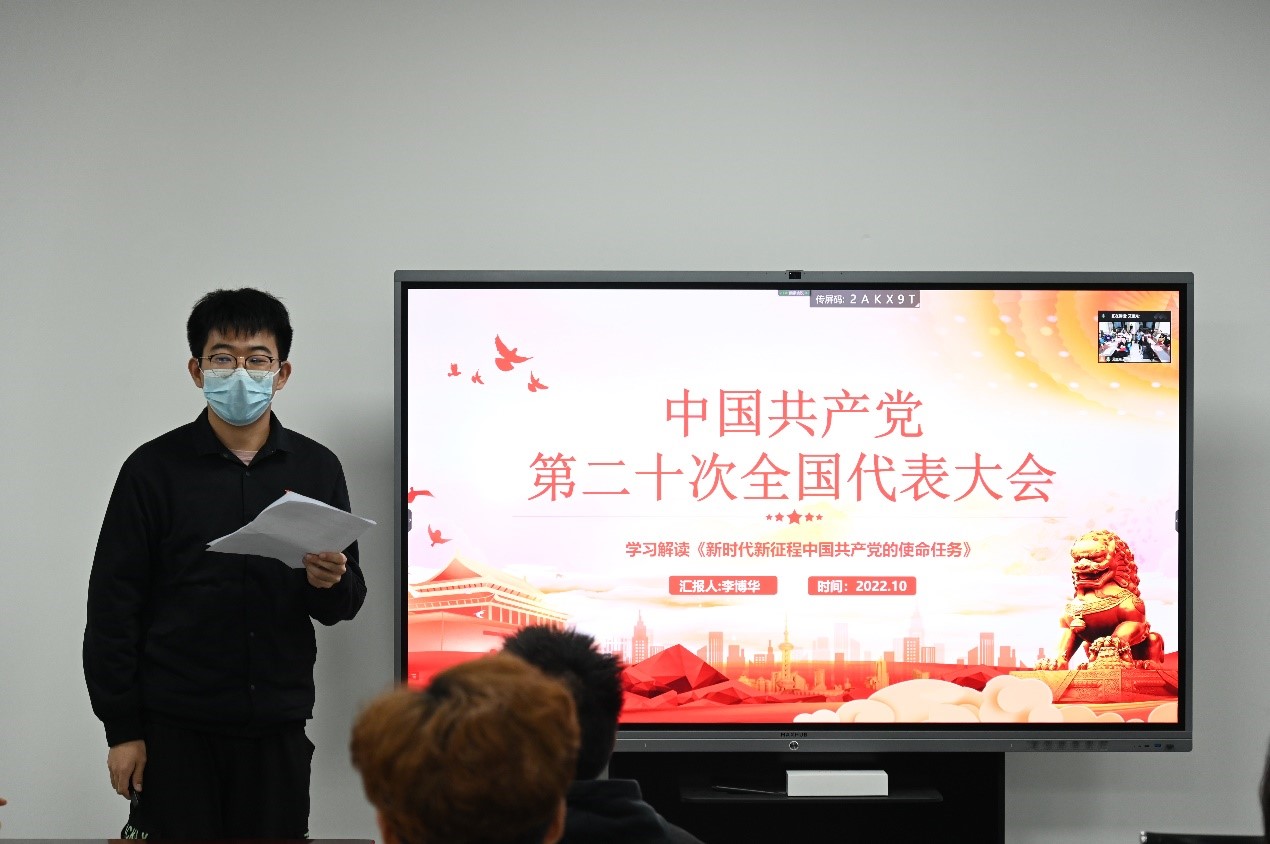 在领学展示环节,15个小组就党的二十大报告的15个主题依次开展了讲解和阐述,并就自己的学习心得与在座党员分享交流。青年党员李傲负责的是《过去五年的工作和新时代十年的伟大变革》这一主题,谈到党的十九大以来,自己亲眼目睹了家乡经历全面小康建设、新农村建设,如今面貌已经焕然一新。青年党员崔子腾负责的是《促进世界和平与发展,推动构建人类命运共同体》这个主题,他先阐述了“人类命运共同体”这一理念的背景和理论依据,然后分层次讲述了它促进世界和平发展、彰显中国态度和智慧以及追求“求同存异、开放包容”三大意义。