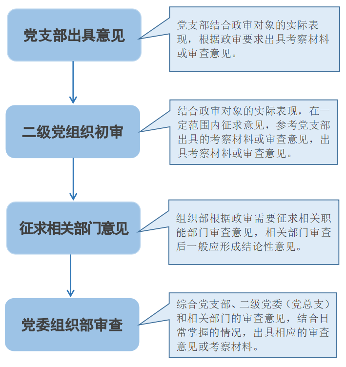 1.党支部出具意见。党支部结合政审对象的实际表现,根据政审要求出具考察材料或审查意见。